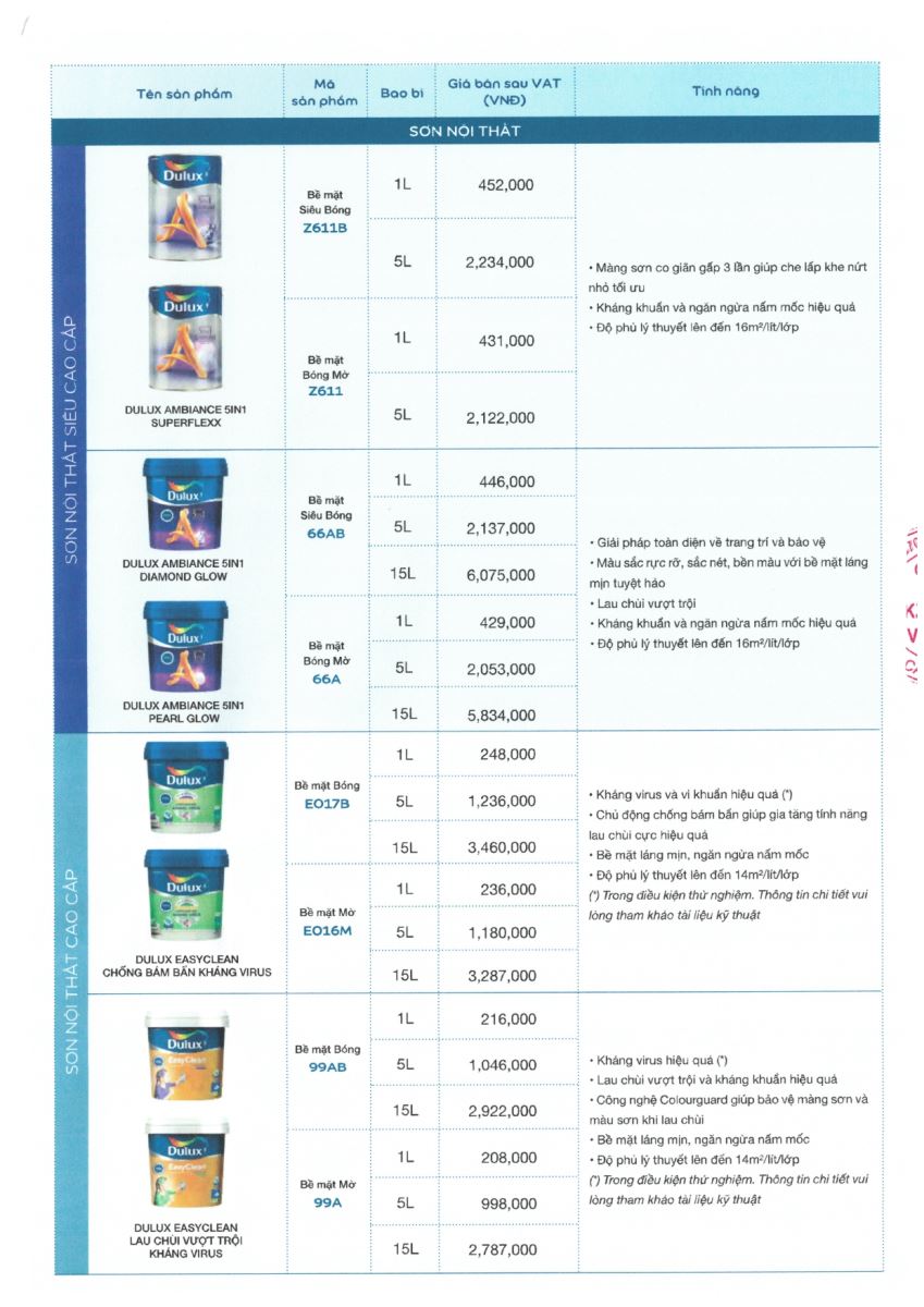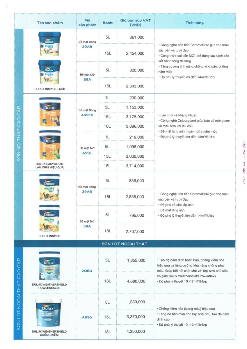 Đây là bảng báo sơn Dulux niêm yết của nhà máy dành cho người tiêu dùng chưa bao gồm mức chiết khấu sơn.